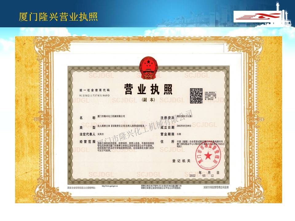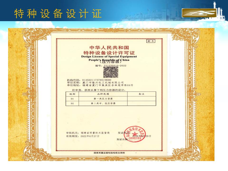 廈門(mén)隆興化工機(jī)械有限公司成立于2001年5月,占地面積30000平方米,擁有生產(chǎn)車(chē)間面積10000平方米及相關(guān)配套的辦公場(chǎng)所3000平方米,其中下料場(chǎng)所1000平方米,不銹鋼制作場(chǎng)所2000平方米,ASME產(chǎn)品制作區(qū)域1200平方米,無(wú)損曝光室30平方米。公司有職工135人,擁有專(zhuān)業(yè)的技術(shù)人員和管理人員36人。公司主要從事設(shè)計(jì)、制造A2級(jí)覆蓋D類(lèi)壓力容器...