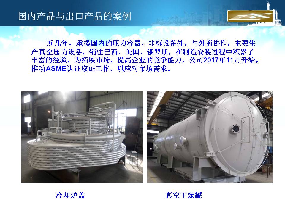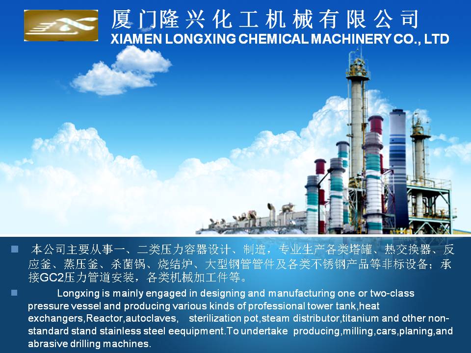 廈門(mén)隆興化工機(jī)械有限公司成立于2001年5月,占地面積30000平方米,擁有生產(chǎn)車(chē)間面積10000平方米及相關(guān)配套的辦公場(chǎng)所3000平方米,其中下料場(chǎng)所1000平方米,不銹鋼制作場(chǎng)所2000平方米,ASME產(chǎn)品制作區(qū)域1200平方米,無(wú)損曝光室30平方米。公司有職工135人,擁有專(zhuān)業(yè)的技術(shù)人員和管理人員36人。公司主要從事設(shè)計(jì)、制造A2級(jí)覆蓋D類(lèi)壓力容器...